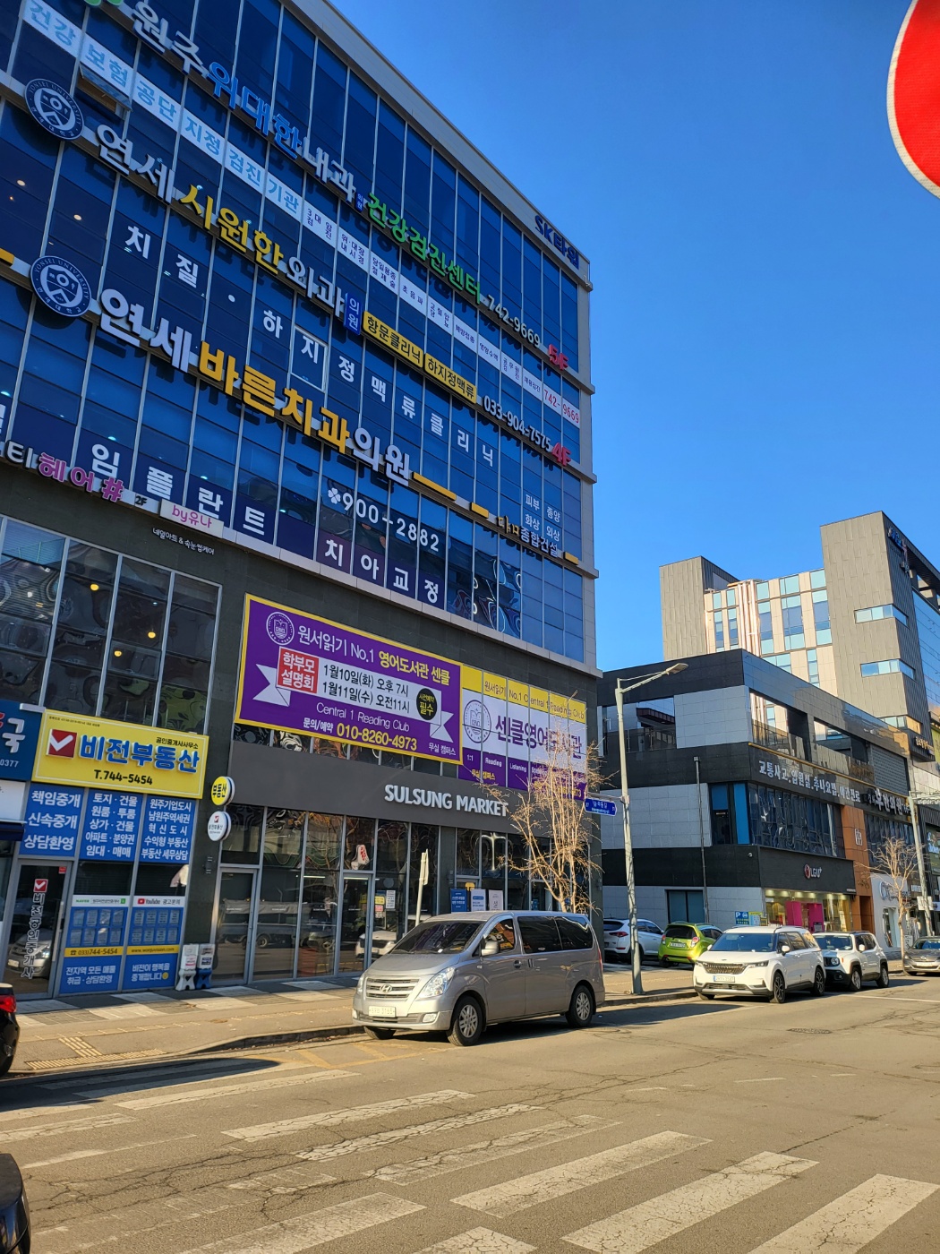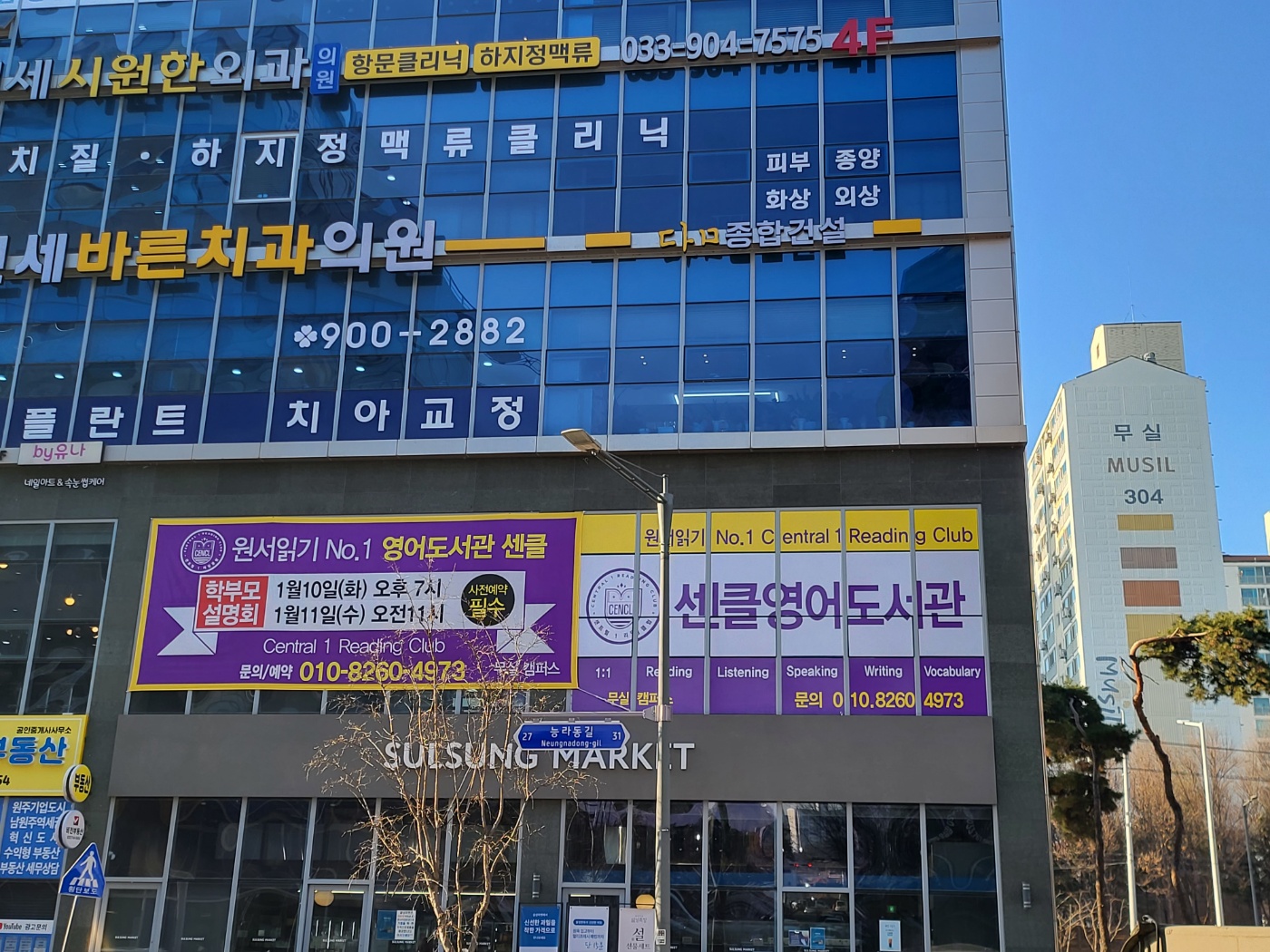위 사진은 원주 사교육 일번지라는 무실동 학원가 거리에 위치한 [능라동길27 SK타워 2층]에 위치한 센클 영어 도서관 모습입니다.